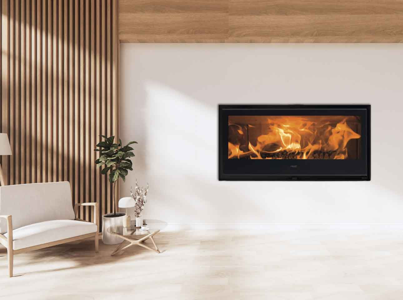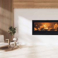 La large vision 16/9ème de la flamme de l'insert à bois Ebano de la marque Kunst permet une très grande visibilité du spectacle de la flamme grâce à sa vitre de 91,5 cm ainsi qu'une puissance de chauffe d'exception. En effet, sa puissance de 9 kW et son rendement de plus de 80% permettent un confort de chauffe, sa grande capacité permet de réchauffer votre intérieur rapidement. Son double corps en acier apporte de la robustesse à ce poêle au design contemporain.