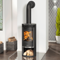 Ce poêle se distingue par sa facilité d’utilisation. La poignée ventilée, couvrant toute la hauteur de la porte, reste froide au toucher, facilitant ainsi l’ouverture et la fermeture de la porte en toute sécurité. Le mécanisme de blocage de porte en position ouverte est particulièrement pratique lors du rechargement en bois. La grande vitre galbée permet d’admirer pleinement le spectacle des flammes, ajoutant une touche esthétique à votre espace de vie. Le Rota 2.0 est également équipé d’un porte-bûcher ouvert, offrant un espace de rangement pratique pour vos bûches, tout en les gardant à portée de main.