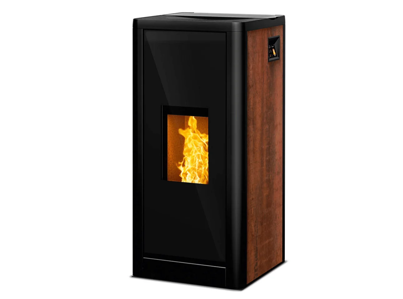 Le poêle à granulés Sumo de Rika se distingue par son design sobre et compact, s'adaptant parfaitement à tous les intérieurs. Son corps en acier noir et ses habillages latéraux personnalisables (aluminium noir, albâtre, effet rouille, métal vieilli, ardoise noire ou verre décor noir) lui confèrent une élégance intemporelle.