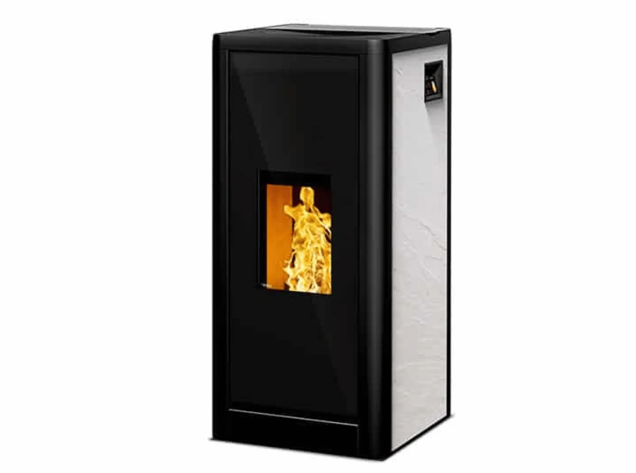 Le poêle à granulés Sumo de Rika se distingue par son design sobre et compact, s'adaptant parfaitement à tous les intérieurs. Son corps en acier noir et ses habillages latéraux personnalisables (aluminium noir, albâtre, effet rouille, métal vieilli, ardoise noire ou verre décor noir) lui confèrent une élégance intemporelle.